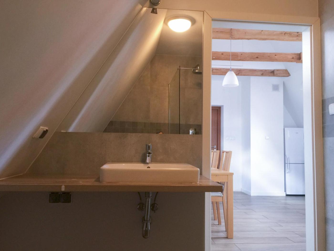 Loft. This apartment includes 1 living room, 1 separate bedroom and 1 bathroom with a walk-in shower and free toiletries. In the well-fitted kitchen, guests will find a stovetop, a refrigerator, kitchenware and a microwave. The apartment has parquet floors, a seating area, a washing machine, a dining area as well as city views. The unit has 2 beds. Powierzchnia pokoju ok.: 41 mkw.