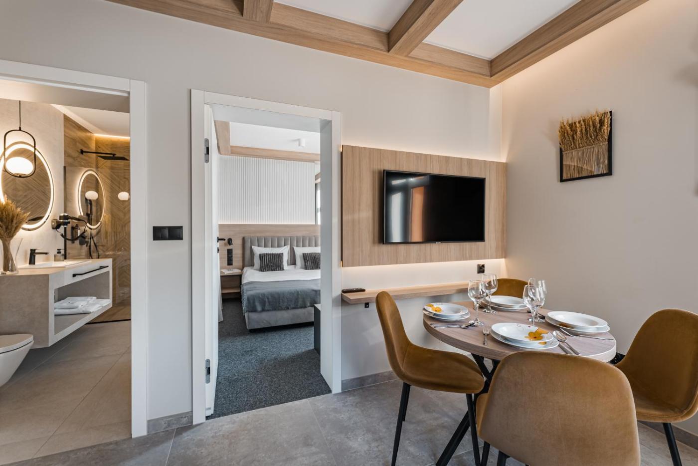 Apartament z 1 sypialnią. This apartment comes with 1 living room, 1 separate bedroom and 1 bathroom with a shower and a hairdryer. Meals can be prepared in the well-fitted kitchen, which features a stovetop, a refrigerator, a dishwasher and kitchenware. The apartment features a tea and coffee maker, a seating area, a dining area, a flat-screen TV with cable channels, as well as mountain views. The unit has 2 beds. Apartament - 4 osobowy. Powierzchnia pokoju ok.: 30 mkw. ;